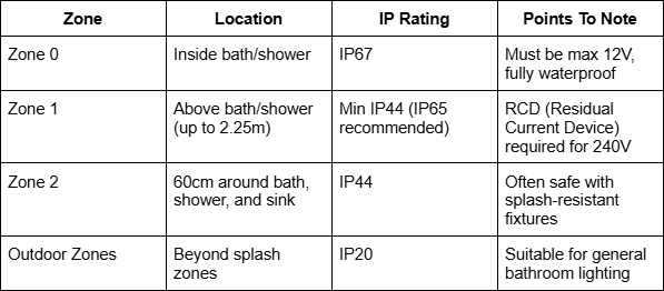 Electricity and water don’t generally go hand-in-hand, so safety should always be a top priority when planning your bathroom lighting. Understanding bathroom zones and the Ingress Protection (IP) rating system is essential to choosing safe, compliant light fittings for each area.
