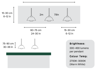 To space three pendants evenly over an island, a helpful rule of thumb is to leave about 15-30cm (6-12”) from each end, and 60-75cm (24-30”) between the centre of each pendant, depending on fixture size. To make sure every detail counts, delve into our guide to understanding the importance of colour temperature, as well as a guide on selecting the right amount of light for your space.