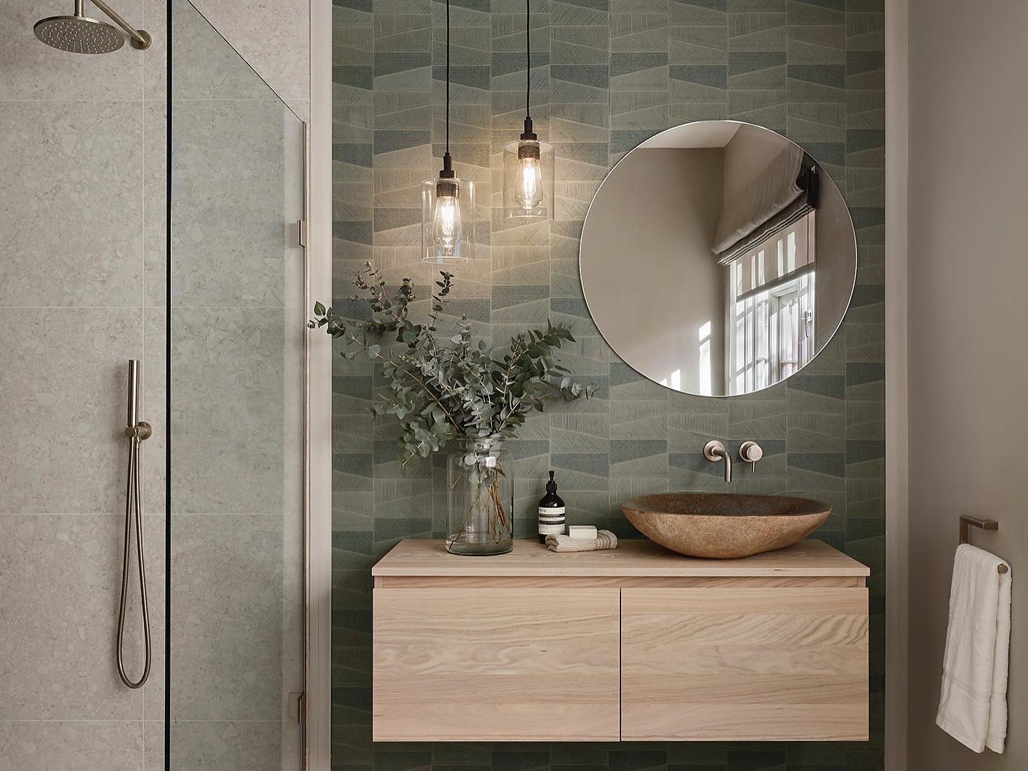 Soft sage tones paired with light wood and minimal styling create a calm atmosphere in this stunning bathroom featuring our Calder pendant lights. Design by Five Sextillion.