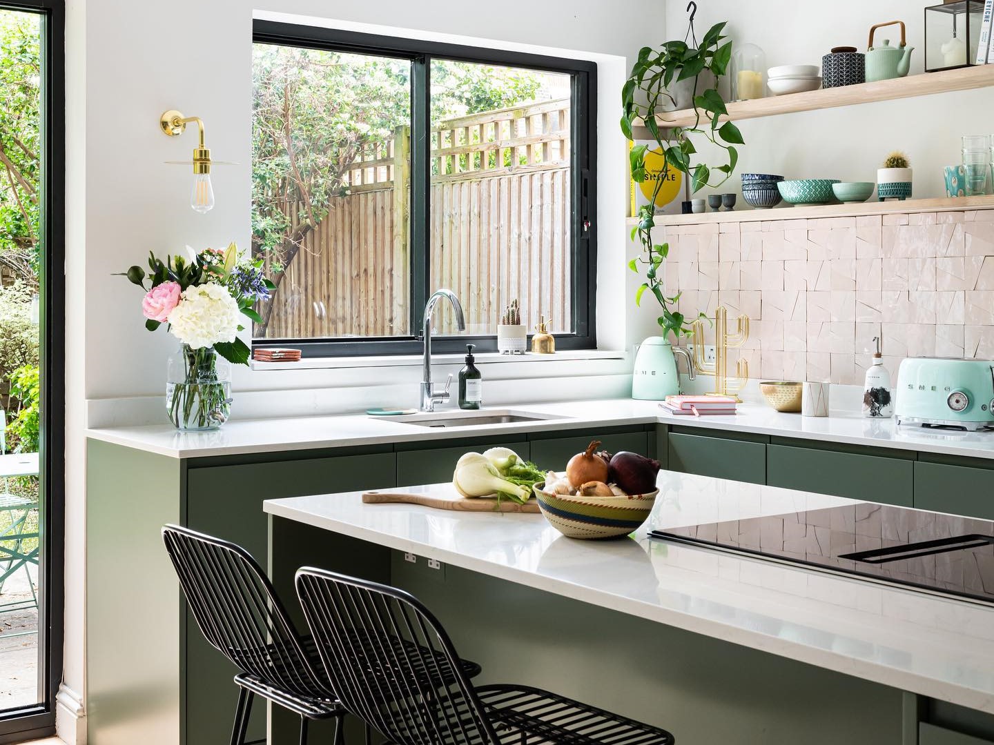 Sleek, statement green cabinets add a fun twist to this sophisticated modern kitchen. Our Kigoma wall light elevates the space with its contemporary design. Design by INTO Interior Design.