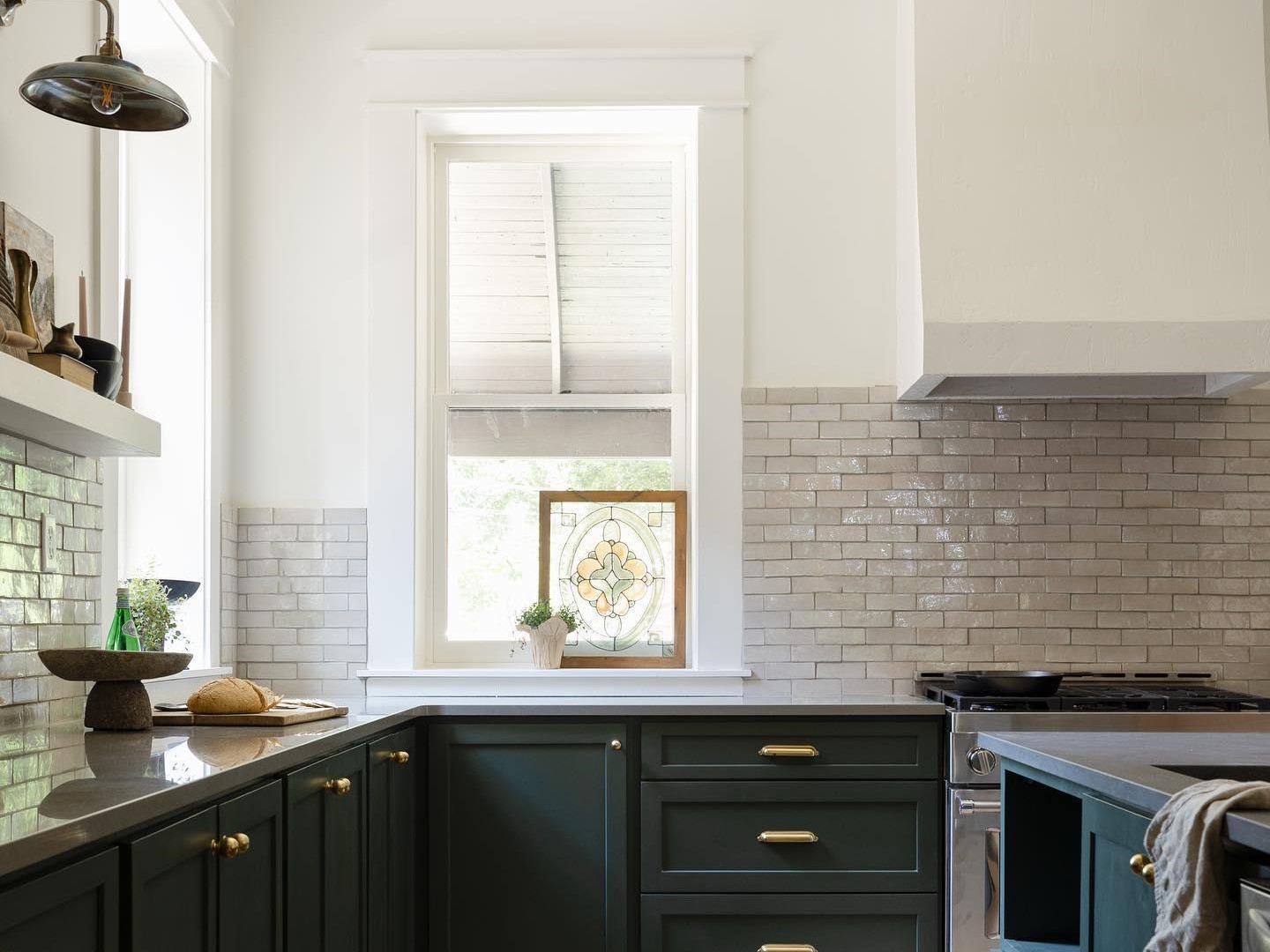 Statement rich forest green cabinets and brass accents add to the charm of this characterful kitchen featuring our Telal wall light. Design by Both Minds Design.