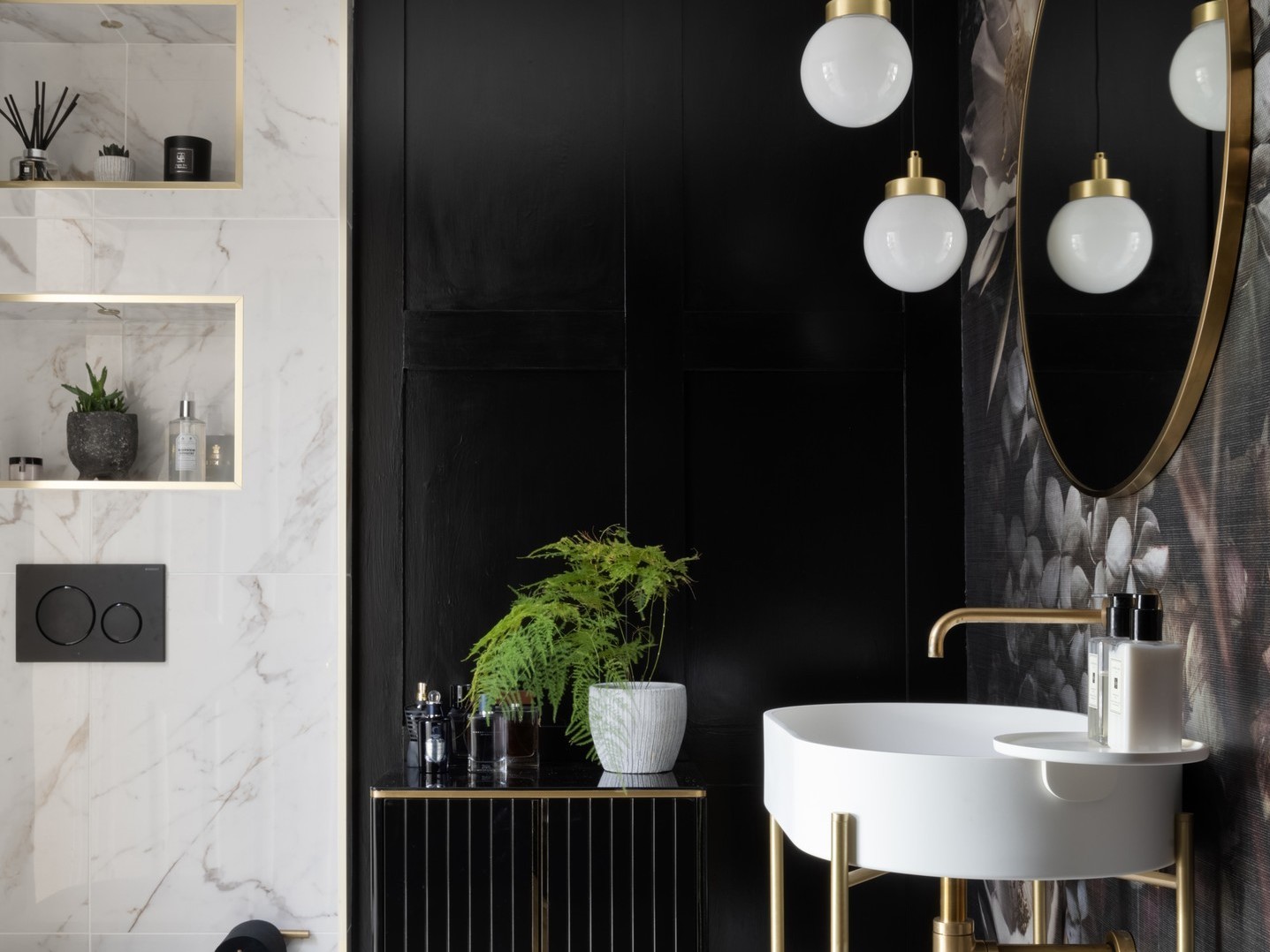 A panelled black feature wall gives this ensuite an intimate but mysterious feel. Our Jordan pendant lights add to the unique ambience of this space. Design by West One Bathrooms.