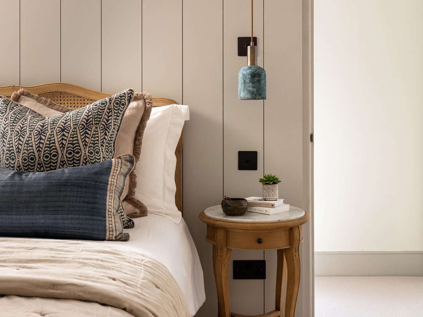A cosy, traditional style bedroom with neutral tones, blue accents and mixed textures and patterns featuring our Osier ceramic pendant light. Design by Nicola O'Mara Interior Design.