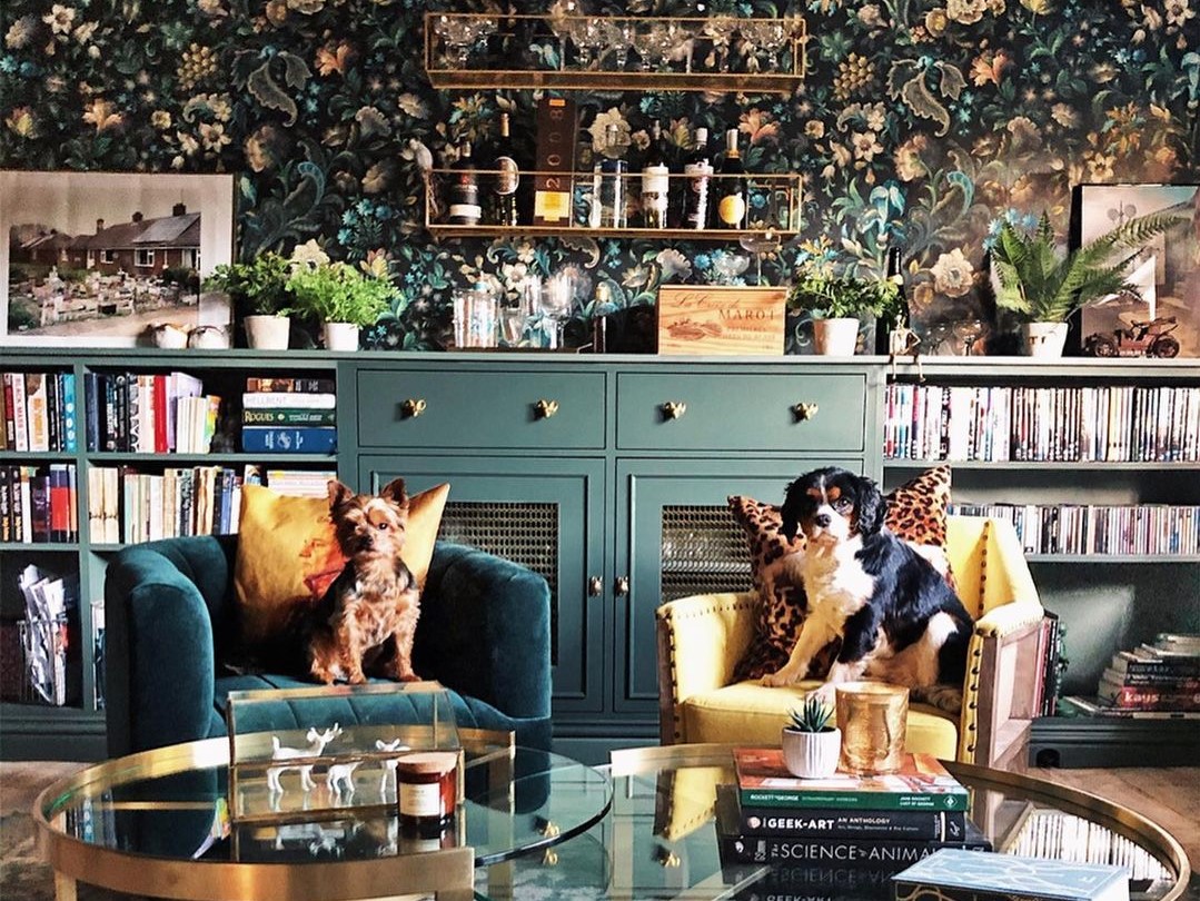 A moody home library with statement floral wallpaper, bold furniture and brass accents. Our San Jose wall lights add to the unique style of this space. Design by Squid and Goose.