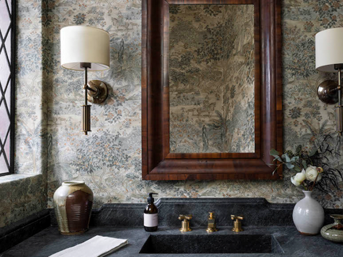 This traditional bathroom oozes character with vintage floral wallpaper and original feature window. Our Gorey wall light adds to the traditional style. Design by Annabode Interior Design.