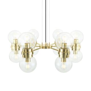 The Wilmot is an impressive globe chandelier with 11 arms. Each arm descends from a central body and curves outwards in a radiant pattern. At the end of each arm a brass gallery - attached to a ball joint - holds a 20cm glass globe in an upward position. The globe can be ordered in clear or opal colour.